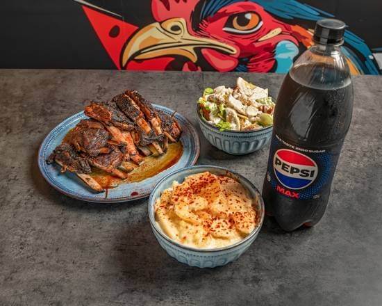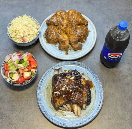 1 whole juicy chicken, FULL Lamb Ribs, 2 large sides with 1.25lt drink