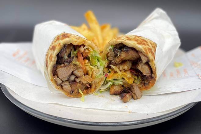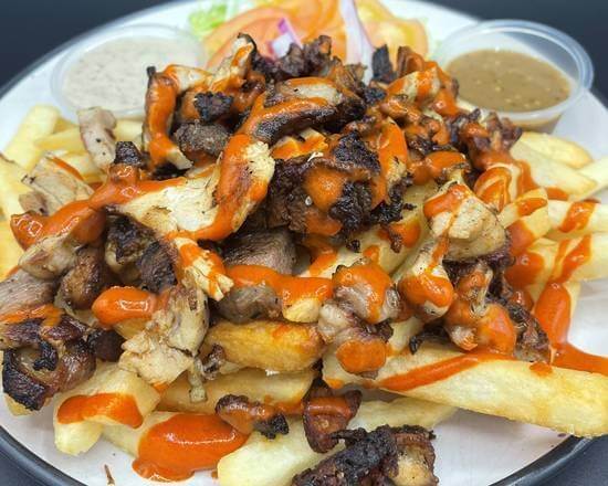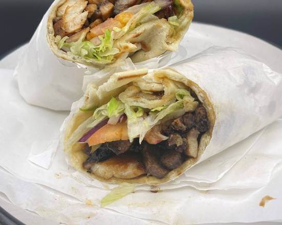 1 Skewer of each meat & marinated prawn served with rice, salad, hummus, garlic sauce & pita bread