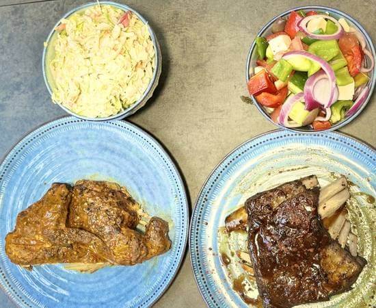 1/2 Chicken, 1/2 Lamb Ribs, 2 Large sides