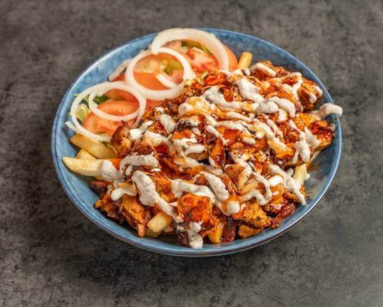 2 skewers of marinated chicken, served with rice, salad, hummus, garlic sauce & pita bread